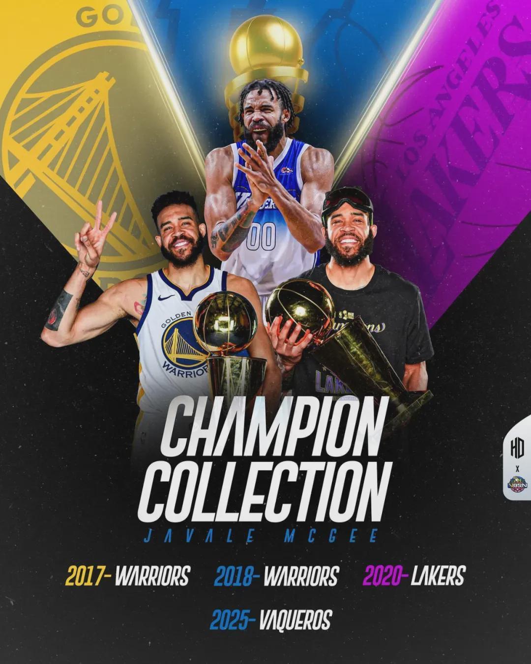 跟大白边相比,麦基在NBA没拿过篮板王,也没拿过盖帽王,但麦基拿了三个总冠军,而且是四年三冠(2017年、2018年和2020年)!此外,麦基的NBA生涯也足够长,从2008年进入NBA到2024年离开,他在NBA打了16个赛季。
