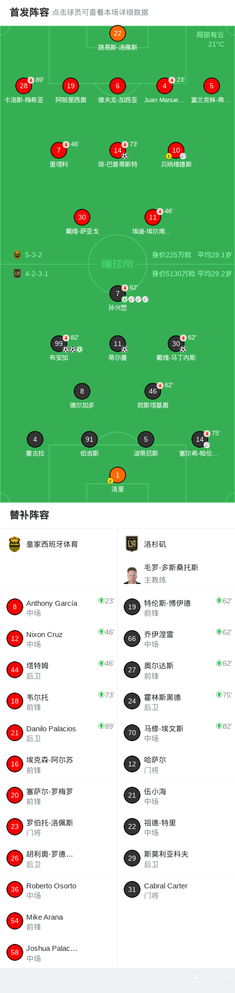 北京时间2月18日中北美冠军联赛 第一轮首回合,皇家西班牙体育对阵洛杉矶。皇家西班牙体育琼-巴普蒂斯特破门。洛杉矶布安加帽子戏法,孙兴慜破门,戴维-马丁内斯破门,蒂尔曼破门。最终比分皇家西班牙体育 1-6 洛杉矶。